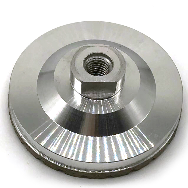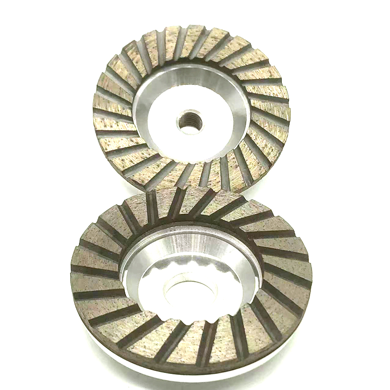 4 Inch Turbo Diamond Cup Wheel is mainly used for coarse grinding of granite, quartz, marble, limestone, sandstone, basalt,artificial stone and any other nature stones, turbo diamond cup wheels has very fast grinding speed and long durability. 4 inch turbo diamond cup wheel is produced by hot pressing machine with is has high brazing strength quality and segments are with completely with turbo shape with aluminum body. Usually it is used for grinding in the first step of rough and coarse grinding before making the fine polishing by hand grinder machine which is very convenient for operator. Diamond grit sizes are available with 36#, 46#, any other diamond grit size will be make according to customer requests.
